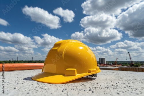 A single yellow hard hat sits on a gray cement floor, ready for use