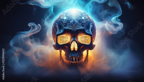A skull surrounded by dark, misty smoke, with an ethereal glow emerging from its hollow eyes, creating a mysterious and eerie atmosphere.