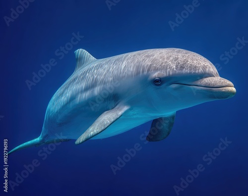 A sleek dolphin swims gracefully in deep blue waters, captured in a side profile shot