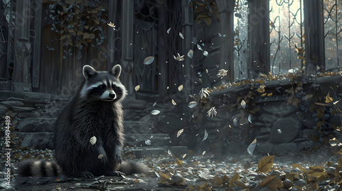 A small raccoon sits on the ground. surrounded by drifting silver moonflower petals in front of an ancient house with eaves and windows.