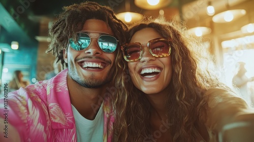 A smiling couple is taking a selfie, enjoying their time together in a modern urban restaurant. Their happiness is infectious, with bright smiles and stylish attire.