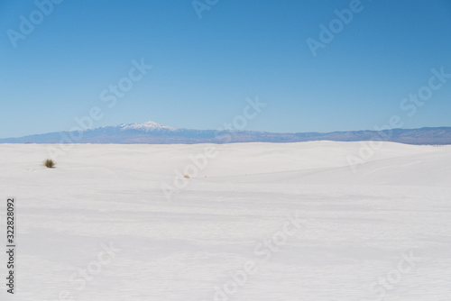 A snow capped mountain peak in the background of White Sands in New Mexico.