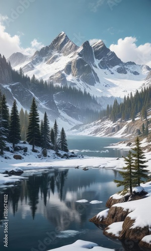 A snow-covered mountain range with a frozen lake and pine trees, snowy mountain range, icy terrain, cold environment