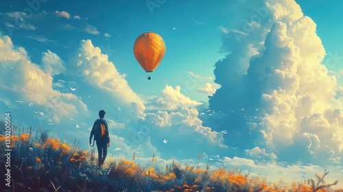 A solitary figure walks towards a golden hot air balloon against a vibrant sky filled with fluffy clouds