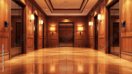 A spacious elevator interior with polished wooden walls, large mirrors, and soft lighting, offering ample room for text or promotional content.