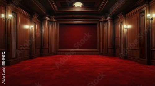 A spacious wooden cinema interior with deep red carpeting and a customizable mock-up wall, perfect for a professional and artistic atmosphere