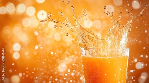 A splash of orange drink in a glass with a vibrant, blurred background.