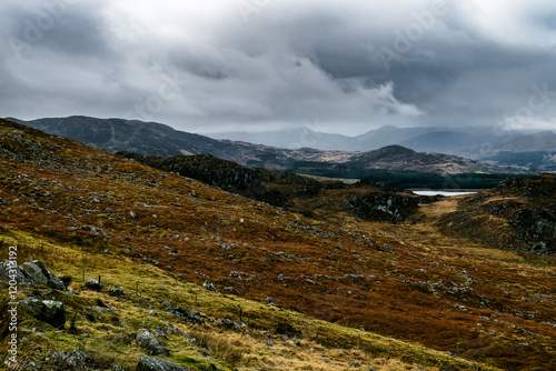 A sprawling view showcases rugged hills and distant mountains blanketed in dark clouds. The earthy tones of the landscape are highlighted by patches of grass and rocky outcrops.