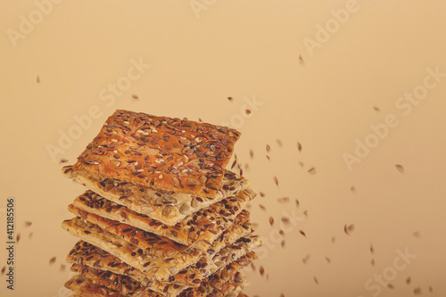 A stack of healthy flaxseed cookies on top of which the seeds are poured on a neutral beige background