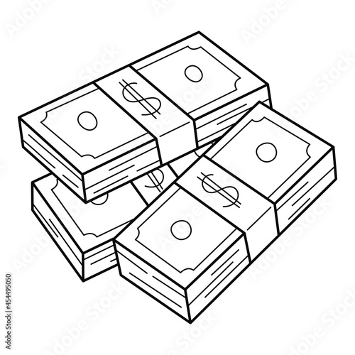 A stack of paper banknotes. Three bundles of dollar bills. Money accumulation, wealth, a bribe. Linear icon. Hand-drawn black and white vector illustration. Isolated on a white background