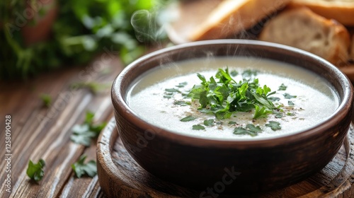 A steaming bowl of homemade soup on a rustic wooden table, garnished with fresh herbs, with a side of warm crusty bread.