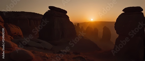 A striking portrayal of a sunset encapsulating the silhouettes of ancient stone formations illustrating the interplay of history and time