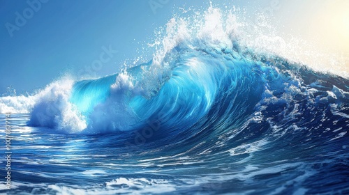 A stunning wave crashing against the shore, showcasing vibrant blue colors and dynamic movement of water under a bright sky.