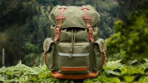 A sturdy, olive green backpack with various compartments, set against a lush, green background, suggesting adventure and outdoor activities.
