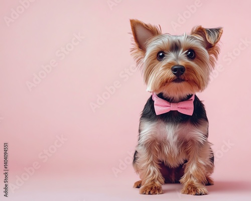 A stylish dog in a pink bow tie against a soft pink background.