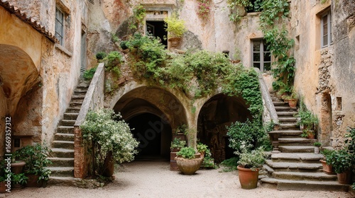 A sun-drenched courtyard of an old stone building, showcasing a winding staircase and lush greenery in terracotta pots, creates a tranquil and romantic scene.