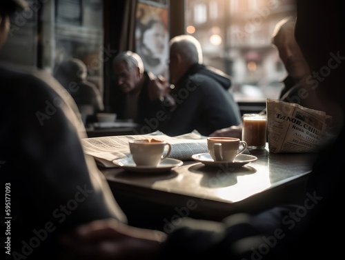 A table in a cafe with cups of coffee, pastries, and a book or newspaper, with people's silhouettes in the background