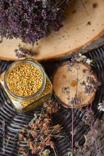 A table with a wicker table top, honey in honeycombs on a wooden board, honey in an open glass jar, with medicinal herbs oregano, chamomile and strawberry flowers. flower pollen collected by bees