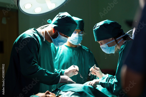 A team of professional doctors perform surgery in a hospital, a group of surgeons working in the operating theater.