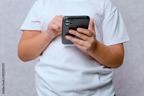 A teenager using a mobile phone on a light background. A concept of modern technology and communication.