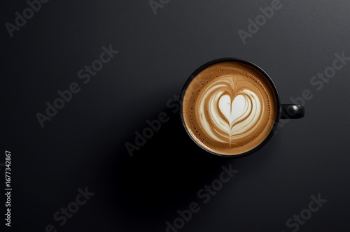A top down view of a black mug filled with creamy latte art featuring a delicate white heart shape on a dark background