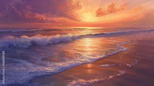 "A tranquil beach at sunset, with the sky painted in orange, pink, and purple. Waves gently lap the shore as someone reflects or finds peace.