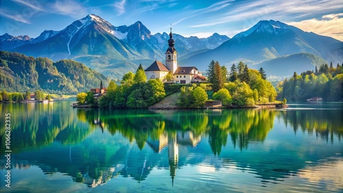 A tranquil church nestled on a small island, surrounded by lush greenery and a serene lake, with towering snow-capped mountains in the background, reflecting in the pristine waters