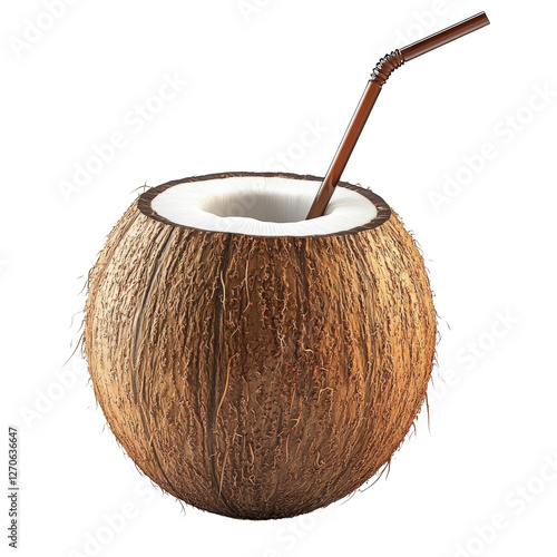 a tropical coconut with a straw, exotic drink element, 3D photorealism, refreshing tones, isolated on white background