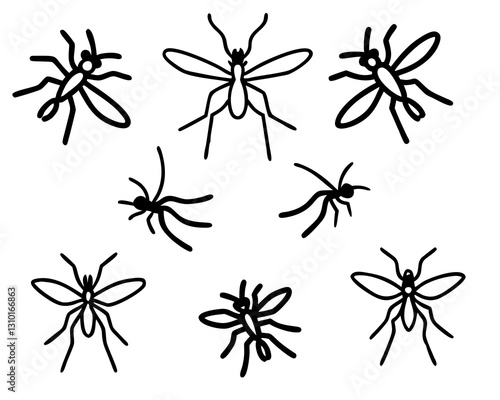 A vector set of mosquitoes, united in diverse poses and styles. Featuring realistic wings, legs, and bodies, these tiny yet striking insects showcase nature’s precision and adaptability in design."