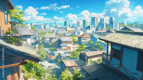 A vibrant and futuristic anime-style cityscape with flying cars and towering skyscrapers. Perfect for science fiction or fantasy projects.