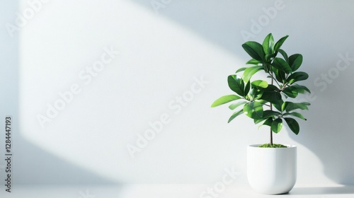 A vibrant green potted plant in a minimalist white pot, casting soft shadows against a bright wall.