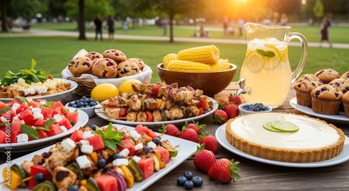A vibrant outdoor picnic table set with a variety of fresh, colorful food items, including grilled chicken skewers, fresh berries, and a pitcher of lemonade