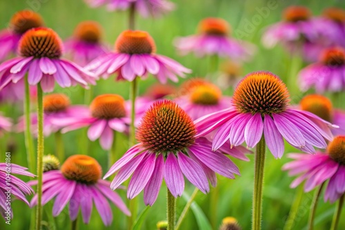 A vibrant patch of purple coneflowers swaying gently in the breeze amidst a sea of green grass, landscape, nature, breeze, cone flowers