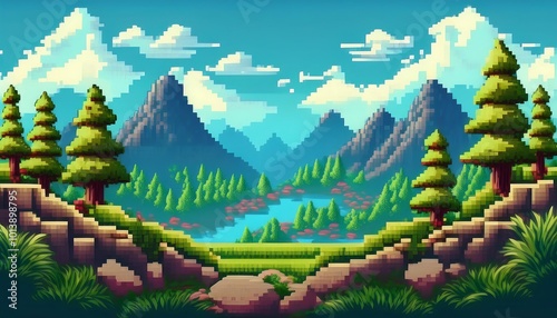 A vibrant pixel art platform game background showcasing rolling mountains and lush greenery under a bright sky. Generative AI