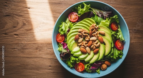 A vibrant salad bowl on wooden table, composed of avocado, lettuce, tomatoes, and nuts