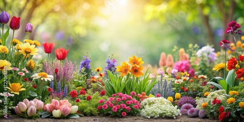 A vibrant spring border surrounded by colorful flowers in a garden, nature, blooms , nature, blooms , foliage, blossoms