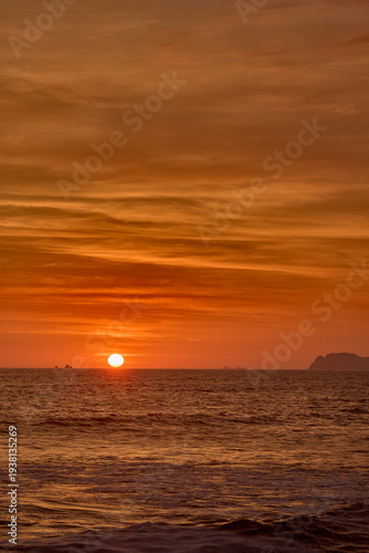 A vibrant summer sunset over the Pacific Ocean along Lima’s Costa Verde, with the silhouette of San Lorenzo Island on the horizon. Warm golden light reflects across the waves