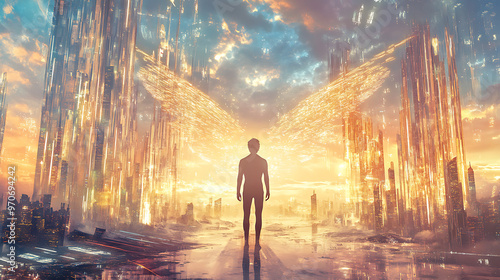A visionary architect standing at the threshold of a futuristic, where the ruins of the past blend seamlessly into the luminous horizon of the future.