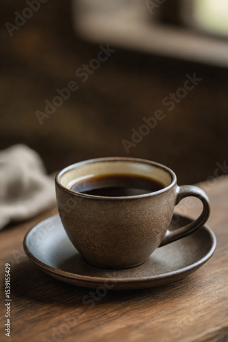 A warm cup of dark coffee sits on a saucer beside a linen napkin on a rustic wooden table, creating a cozy and inviting atmosphere.