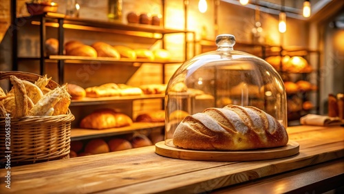 A warm golden light shines through the glass case of a bakery, illuminating a perfectly baked loaf of freshly risen bread, with an inviting aroma wafting out , kitchen decor, artisanal bread
