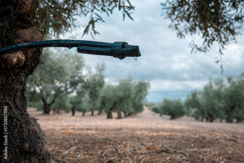 A water droplet falls from an irrigation hose attached to an olive tree, highlighting sustainable farming and water management in agriculture.