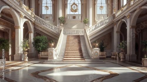 A wide-angle view of a grand marble staircase with intricate designs and elegant banisters, set in a luxurious building, evoking a sense of sophistication and class.