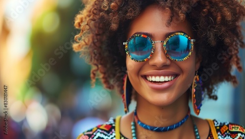 a woman with a afro wearing sunglasses and smiling
