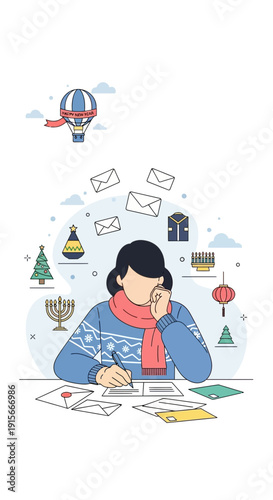 A Woman Writing Letters Amidst Diverse Icons Representing Holidays and Travel
