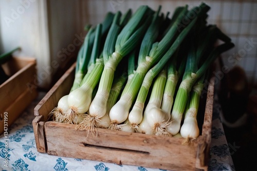 A wooden crate filled with freshly harvested green onions sits on a rustic table. The vibrant green tops contrast with the white bulbs, showcasing natural produce ready for sale