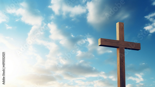 A wooden cross stands against a vivid sky, clouds parting around it, symbolizing hope and faith, with ample space for text on the serene backdrop.