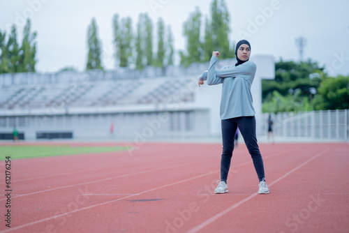A young asian Muslim woman wearing a black hijab is exercising and running at an outdoor stadium in the morning. Modern Muslim woman concept, Muslim woman sport concept, Islam