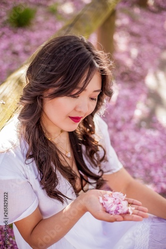 A young beautiful Asian woman in a white dress walks in a flowered park. Sakura. Blooming trees.