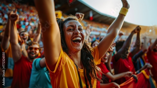 A young girl fan, along with a group of fans, are cheering for the victory of their team at a sports stadium.