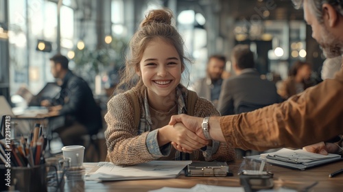 A young girl smiles while shaking hands in a cozy café, capturing a moment of connection and positivity amidst a bustling environment.
